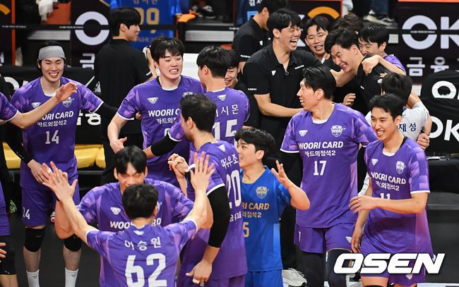 2일 부산 강서실내체육관에서 진에어 2025-2026 V리그 남자부 OK저축은행과 우리카드의 경기가 열렸다. 마우리시오 파에스 감독이 지휘봉을 내려놓은 가운데, 우리카드 박철우 감독대행이 첫 경기에서 세트 스코어 3-2로 역전승했다. 우리카드 박철우 감독대행이 5세트 승리를 결정짓고 기쁨을 나누고 있다. 2026.01.02 / foto0307@osen.co