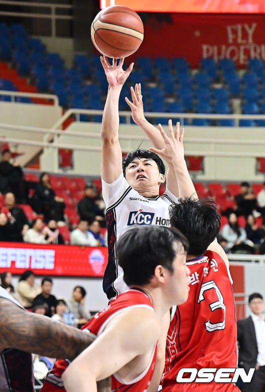 6일 울산 동천체육관에서 2025-2026 LG전자 프로농구 울산 현대모비스와 부산 KCC의 경기가 열렸다. 울산 현대모비스와 부산 KCC가 각각 2연패와 4연패의 위기를 딛고 나란히 연패 탈출의 돌파구를 찾아야 하는 절실한 상황에 놓여 있다. 부산 KCC 최진광이 울산 현대모비스 박무빈의 마크를 피해 슛을 시도하고 있다. 2026.01.06 / foto0