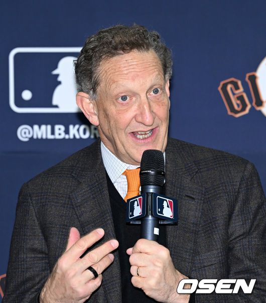 7일 오후 경기 이천 LG 챔피언스파크에서 샌프란시스코 자이언츠 미디어데이가 열렸다. 샌프란시스코 구단은 이정후와 비텔로 감독, 윌리 아다메스가 참여하는 방한 프로그램을 진행 중이다. 이번 샌프란시스코의 한국 방문에는 래리 베어 CEO, 버스터 포지 사장, 잭 미나시안 단장 등 구단 주요 인사들이 함께한다. 샌프란시스코 래리 베어 CEO가 취재진 질문에 답