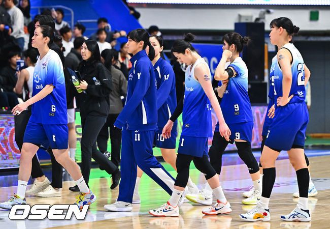 BNK썸가 신한은행을 꺾고 후반기 첫승을 신고했다. 부산 BNK썸은 10일 인천 중구 도원체육관에서 열린 BNK금융 2025~2026 여자프로농구 인천 신한은행과의 경기에서 74-61로 승리했다. 반면 인천 신한은행은 7연패에 빠지며 최하위를 유지했다. 경기종료후 7연패 빠진 신한은행 선수들이 아쉬워하고 있다. 2026.01.10 / soul1014@ose