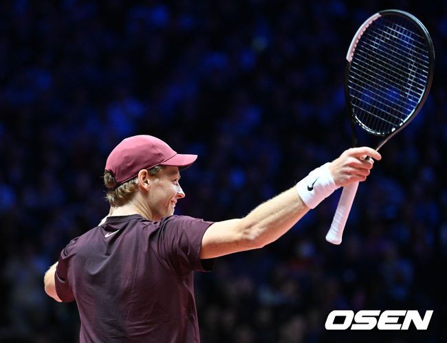 카를로스 알카라스(스페인)와 얀니크 신네르(이탈리아)가 벌이는 ‘현대카드 슈퍼매치 14’가 10일 오후 인천 중구 인스파이어 아레나에서 열렸다. 얀니크 신네르(2위·이탈리아)의 경기는 알카라스의 2-0(7-5 7-6<8-6>) 승리로 끝났다. 신네르가 득점 후 환호하고 있다. 2026.01.10 /sunday@osen.co.kr