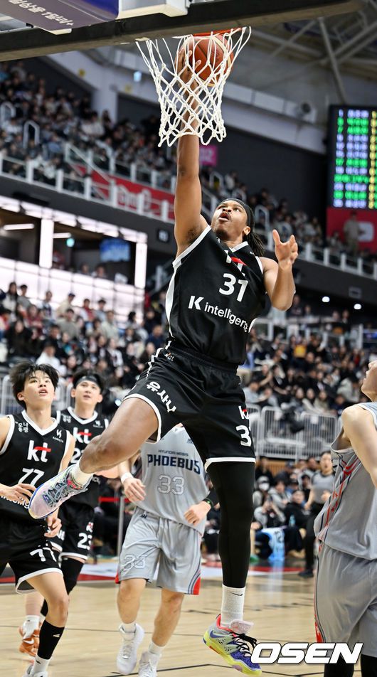 11일 오후 수원 KT 소닉붐 아레나에서 2025-2026 LG전자 프로농구 수원 KT 소닉붐과 울산 현대모비스 피버스의 경기가 열렸다. 수원 KT는 15승 16패로 6위, 울산 현대모비스는 10승 20패로 8위를 기록 중이다. 4쿼터 KT 힉스가 속공에 성공하고 있다. 2026.01.11 /rumi@osen.co.kr