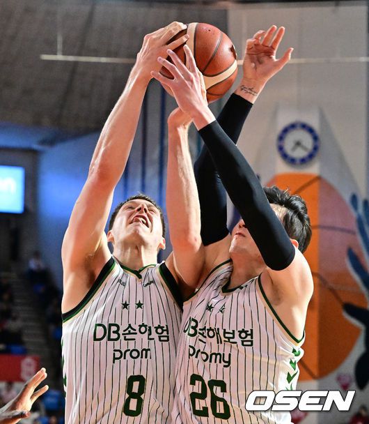 19일 오후 서울 잠실학생체육관에서 2025-2026 LG전자 프로농구 서울 SK와 원주 DB의 경기가 열렸다. SK는 17승 13패 4위, 8연승에 도전하는 DB는 20승 10패 2위를 기록중이다. 2쿼터 DB 엘런슨, 강상재가 리바운드를 다투고 있다. 2026.01.13/ jpnews@osen.co.kr