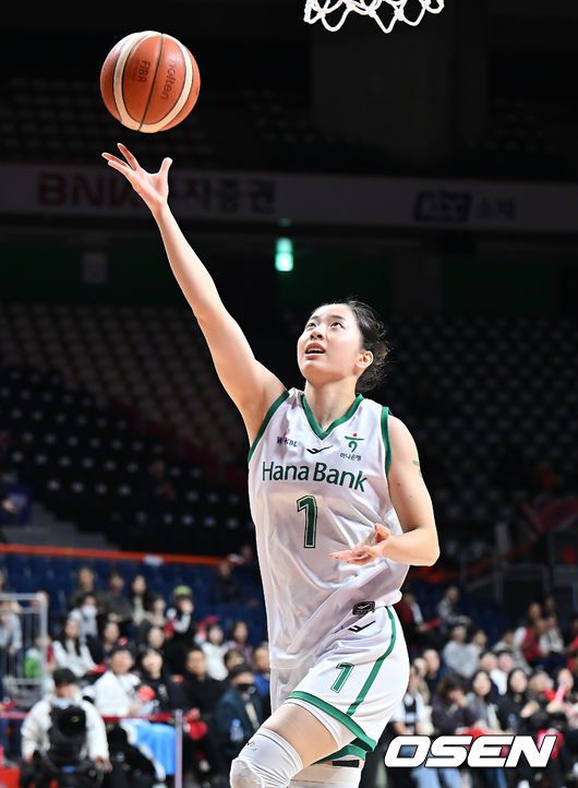 14일 부산 사직실내체육관에서 BNK금융 2025~2026 여자프로농구 부산 BNK와 부천 하나은행의 경기가 열렸다. BNK는 KB스타즈와 함께 8승 6패로 공동 2위에 올라 있는 가운데, 5연승으로 부동의 1위를 질주 중인 하나은행을 상대로 단독 2위 도약에 도전한다. 부천 하나은행 박소희가 속공에 이은 골밑슛을 하고 있다. 2026.01.14 / fot
