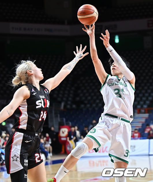 19일 부산 사직실내체육관에서 BNK금융 2025~2026 여자프로농구 부산 BNK와 부천 하나은행의 경기가 열렸다. BNK는 KB스타즈와 함께 8승 6패로 공동 2위에 올라 있는 가운데, 5연승으로 부동의 1위를 질주 중인 하나은행을 상대로 단독 2위 도약에 도전한다. 부천 하나은행 진안이 부산 BNK 김소니아의 마크를 피해 골밑슛을 시도하고 있다. 20
