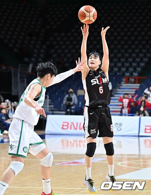 19일 부산 사직실내체육관에서 BNK금융 2025~2026 여자프로농구 부산 BNK와 부천 하나은행의 경기가 열렸다. BNK는 KB스타즈와 함께 8승 6패로 공동 2위에 올라 있는 가운데, 5연승으로 부동의 1위를 질주 중인 하나은행을 상대로 단독 2위 도약에 도전한다. 부산 BNK 이소희가 부천 하나은행 진안의 마크를 피해 슛을 시도하고 있다. 2025.