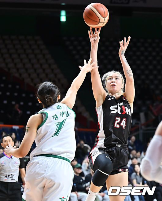 19일 부산 사직실내체육관에서 BNK금융 2025~2026 여자프로농구 부산 BNK와 부천 하나은행의 경기가 열렸다. BNK는 KB스타즈와 함께 8승 6패로 공동 2위에 올라 있는 가운데, 5연승으로 부동의 1위를 질주 중인 하나은행을 상대로 단독 2위 도약에 도전한다. 부산 BNK 김소니아가 부천 하나은행 정예림의 마크를 피해 골밑슛을 시도하고 있다. 2