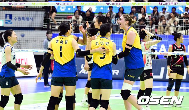 16일 경기도 수원체육관에서 ‘진에어 2025~2026 프로배구 V리그’ 여자부 현대건설과 정관장의 경기가 열렸다. 현대건설은 정관장을 상대로 세트 스코어 3-0(25-20, 25-22, 29-27)으로 승리했다. 현대건설이 승리를 기뻐하고 있다. 2026.01.16 /cej@osen.co.kr