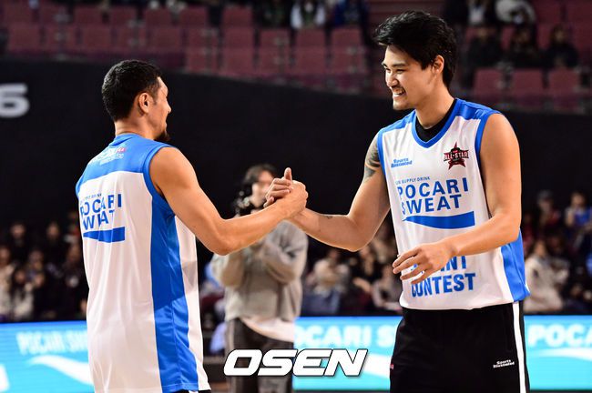 17일 서울 송파구 잠실실내체육관에서 2025-2026 LG전자 프로농구 올스타전 전야제가 열렸다. 이번 올스타전은 2015-2016시즌 이후 10년 만에 잠실실내체육관에서 열리는 경기이자, 해당 체육관 철거 전 마지막으로 열리는 올스타전이다. DB 알바노, SK 톨렌티노가 포카리스웨트 3점슛 콘테스트 예선을 마친 뒤 악수하고 있다. 2026.01.17 /