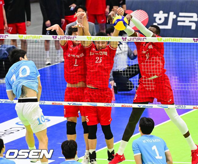 20일 오후 수원실내체육관에서 진에어 2025-2026 V리그 남자부 한국전력과 대한항공의 경기가 진행됐다. 대한항공은 주전 아웃사이드 히터들의 부상 속에 4연패 뒤 1승을 거뒀지만 여전히 현대캐피탈에 승점 1 차로 쫓기며 1위 수성이 불안하고, 한국전력은 승점 35의 4위로 대한항공을 잡으면 3위로 올라설 수 있다. 2세트 한국전력 신영석과 베논이 대한항