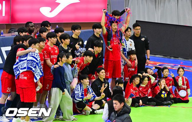 [사진]3위 도약 한국전력, 대한항공 상대 시즌 첫 승리 기념하며