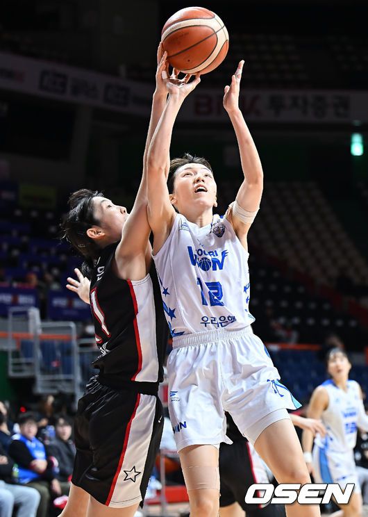 21일 부산 사직실내체육관에서 BNK금융 2025~2026 여자프로농구 부산 BNK와 아산 우리은행의 경기가 열렸다. BNK는 최근 8일간 4경기와 주말 백투백, 2차 연장 혈투까지 치르며 체력 부담이 큰 상황 속에서 우리은행과 3위 자리를 놓고 맞붙는다. 아산 우리은행 오니즈카 아야노가 부산 BNK 김정은의 마크를 피해 골밑슛을 시도하고 있다. 2026.