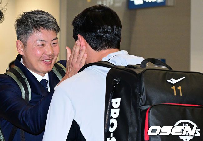 [사진]두산 김원형 감독, '출국장에서 만난 함덕주 쓰담쓰담'