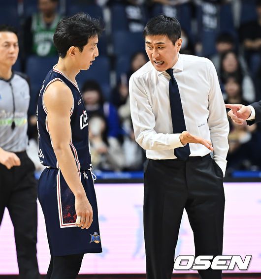 23일 부산 사직체육관에서 2025-2026 LG전자 프로농구 부산 KCC와 창원 LG의 경기가 열렸다. 허웅·송교창이 복귀한 KCC가 타마요·양홍석 이탈로 전력 공백이 생긴 LG를 상대로 길었던 LG전 10연패 탈출을 노린다. 부산 KCC 이상민 감독이 허훈에게 작전 지시를 하고 있다. 2026.01.23 / foto0307@osen.co.kr