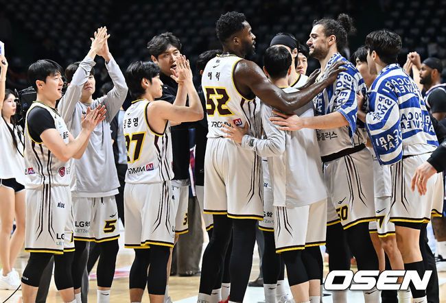 23일 부산 사직체육관에서 2025-2026 LG전자 프로농구 부산 KCC와 창원 LG의 경기가 열렸다. LG가 82-65로 KCC전 11연승을 올렸다. 창원 LG 선수들이 승리 기쁨을 나누고 있다. 2026.01.23 / foto0307@osen.co.kr