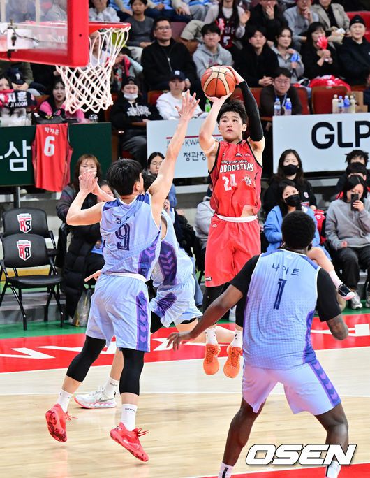 23일 오후 안양 정관장 아레나에서 2025-2026 LG전자 프로농구 안양 정관장과 고양 소노의 경기가 열렸다. 이날 정관장은 소노에 65-64 짜릿한 역전승을 거뒀다. 4쿼터 정관장 문유현이 점프슛을 성공시키고 있다. 2026.01.23 /jpnews@osen.co.kr