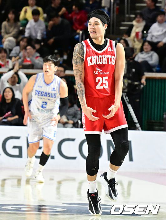 24일 서울 잠실학생체육관에서 2025-2026 LG전자 프로농구 서울 SK와 대구 한국가스공사의 경기가 열렸다. SK는 4위(19승 14패), 한국가스공사는 10위(11승 22패)를 기록중이다. 3쿼터 SK 톨렌티노가 3점슛을 성공시키며 기뻐하고 있다. 2026.01.24 /jpnews@osen.co.kr