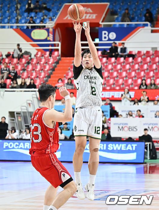 24일 울산 동천체육관에서 2025-2026 LG전자 프로농구 울산 현대모비스와 원주 DB의 경기가 열렸다. 올 시즌 원주 DB와의 세 차례 맞대결에서 모두 고개를 숙인 울산 현대모비스가 홈 코트에서 연승 흐름을 이어갈 수 있을지 관심이 쏠린다. 원주 DB 정효근이 울산 현대모비스 이승현의 마크를 피해 3점슛을 시도하고 있다. 2026.01.24 / fot