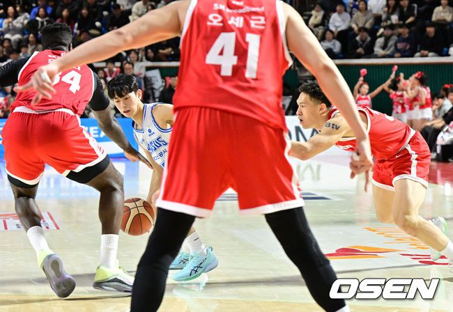 24일 서울 잠실학생체육관에서 2025-2026 LG전자 프로농구 서울 SK와 대구 한국가스공사의 경기가 열렸다. SK는 4위(19승 14패), 한국가스공사는 10위(11승 22패)를 기록중이다. 4쿼터 한국가스공사 양우혁이 SK 다니엘의 수비를 피해 드리블을 하고 있다. 2026.01.24 /jpnews@osen.co.kr
