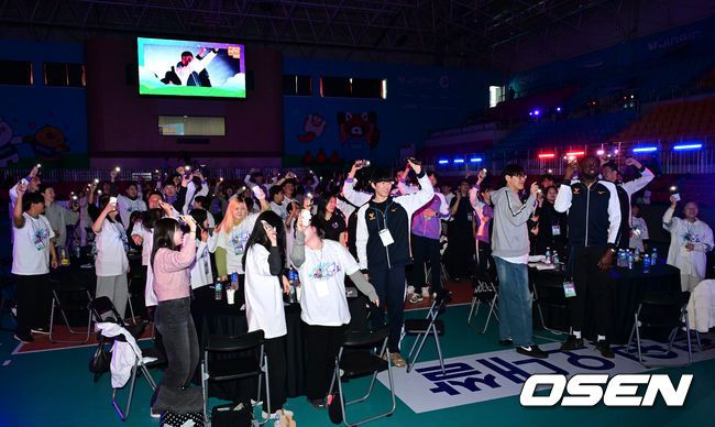 24일 오후 강원도 춘천 호반체육관에서 ‘진에어 2025~2026 V리그’ 올스타전 사전행사가 열렸다. 이날 사전행사에는 팬 80명을 초청해 올스타 선수들과 다양한 게임을 펼치며 서로 교감하는 시간을 가졌다. 올스타 선수들과 팬들이 춤을 추고 있다. 2026.01.24 / dreamer@osen.co.kr