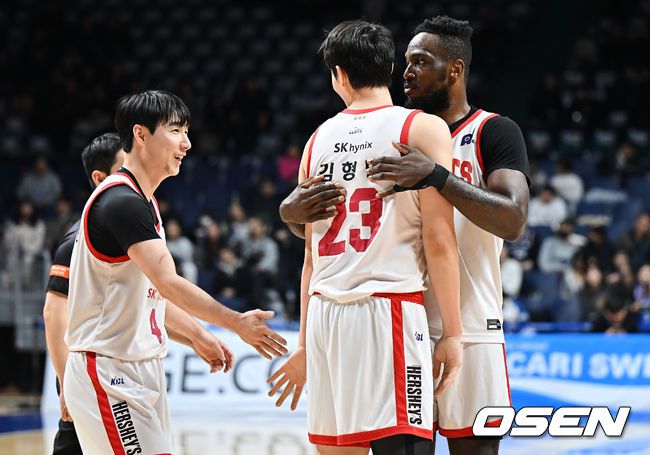 25일 부산 사직체육관에서 2025-2026 LG전자 프로농구 부산 KCC와 서울 SK의 경기가 열렸다. 부상자 복귀에도 완전한 경기력을 회복하지 못한 KCC와 강행군 속 주전 안영준까지 이탈한 SK가 정상 전력이 아닌 상태로 맞대결을 펼친다. 서울 SK 김형빈이 골을 성공시키고 자밀 워니, 김낙현의 축하를 받고 있다. 2026.01.25 / foto030
