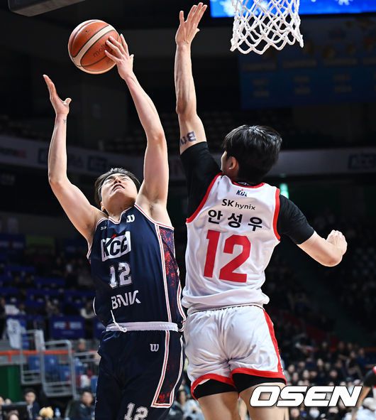 25일 부산 사직체육관에서 2025-2026 LG전자 프로농구 부산 KCC와 서울 SK의 경기가 열렸다. 부상자 복귀에도 완전한 경기력을 회복하지 못한 KCC와 강행군 속 주전 안영준까지 이탈한 SK가 정상 전력이 아닌 상태로 맞대결을 펼친다. 부산 KCC 김훈이 서울 SK 안성우의 마크를 피해 골밑슛을 시도하고 있다. 2026.01.25 / foto030