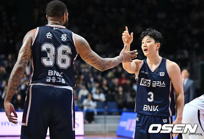 15일 부산 사직체육관에서 2025-2026 LG전자 프로농구 부산 KCC와 수원 KT의 경기가 열렸다. 0.5게임차 5위와 6위로 치열한 중위권 경쟁 중인 KCC와 KT가 맞대결을 펼친다. 부산 KCC 허웅이 숀롱과 시간에 대해 얘기하고 있다. 2026.02.15 / foto0307@osen.co.kr