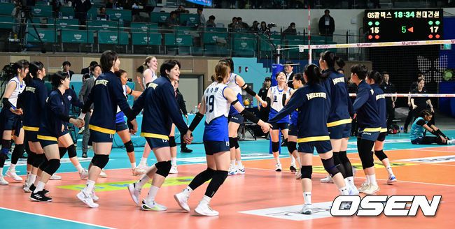 16일 오후 서울 장충체육관에서 ‘진에어 2025~2026 프로배구 V리그’ 여자부 GS칼텍스와 페퍼저축은행의 경기가 열렸다. 현대건설이 GS칼텍스를 3-2(26-24, 22-25, 20-25, 25-20, 17-15)로 꺾고 3연승을 성공했다. 현대건설이 승리를 기뻐하고 있다. 2026.02.16 /cej@osen.co.kr