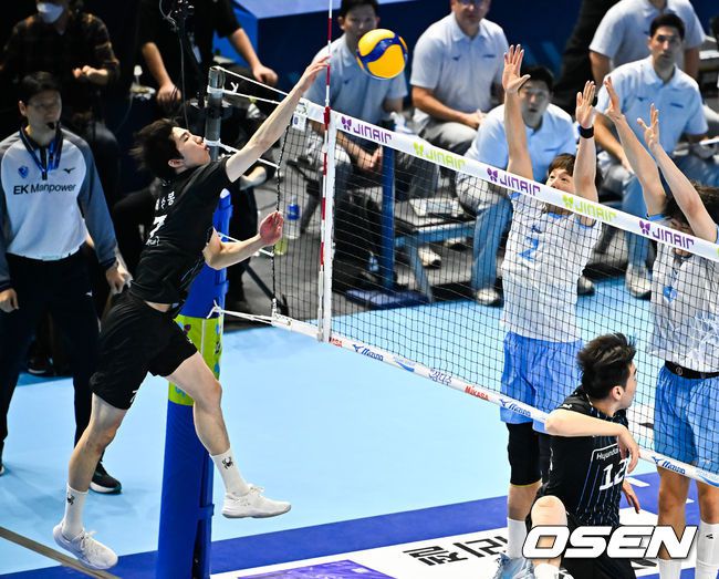 22일 오후 인천 계양체육관에서 프로배구 진에어 2025~26 V리그 대한항공과 현대캐피탈의 경기가 열렸다. 이 경기에서 대한항공은 현대캐피탈에 3-0(25-19, 25-16, 25-20) 셧아웃 완승을 거두며 1위에 올라섰다. 2세트 현대캐피탈 허수봉이 강타를 때리고 있다. 2026.02.22 / rumi@osen.co.kr
