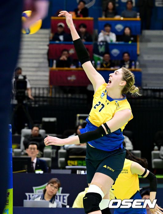 24일 수원체육관에서 ‘진에어 2025~2026 프로배구 V리그’ 여자부 현대건설과 한국도로공사의 경기가 열렸다. 현대건설은 19승11패(승점 56)로 리그 2위를, 한국도로공사는 21승 9패(승점59)로 1위를 기록 중이다. 3세트 현대건설 카리가 공격 득점을 올리고 있다. 2026.02.24 /cej@osen.co.kr