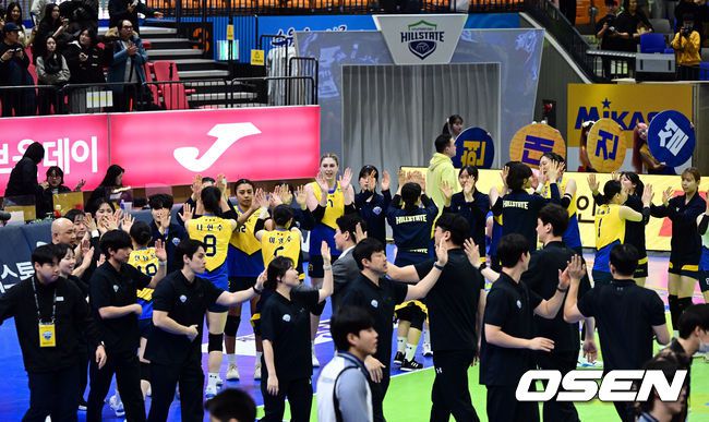 24일 수원체육관에서 ‘진에어 2025~2026 프로배구 V리그’ 여자부 현대건설과 한국도로공사의 경기가 열렸다. 현대건설은 한국도로공사와 경기에서 세트스코어 3-2(26-24, 25-17, 23-25, 10-25, 15-10)로 승리하며 5연승을 달렸다. 현대건설이 승리를 기뻐하고 있다. 2026.02.24 /cej@osen.co.kr