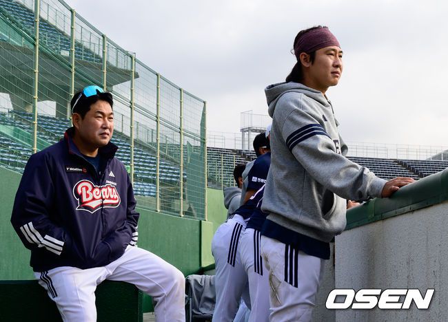 두산 베어스가 25일 일본 미야자키 산마린 스타디움에서 일본프로야구 세이부 라이온스와의 구춘대회 첫 경기를 가졌다. 이날 두산은 세이부에 3-6으로 패했다. 두산 박찬호, 최원준, 양의지가 경기를 지켜보며 이야기를 나누고 있다. 2026.02.25 /jpnews@osen.co.kr