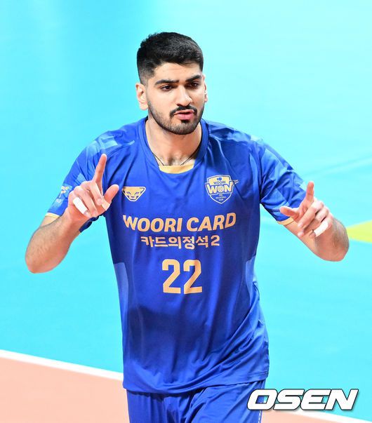 25일 오후 서울 장충체육관에서 프로배구 진에어 2025~26 V리그 우리카드와 OK저축은행의 경기가 열렸다. 홈팀 우리카드는 15승 15패 리그 6위, OK저축은행은 15승 15패 5위에 올라 있다. 1세트 우리카드 알리가 서브 득점에 환호하고 있다. 2026.02.25 /sunday@osen.co.kr
