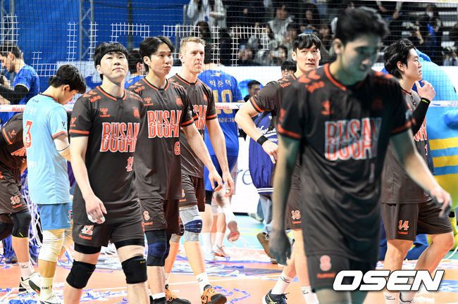 우리카드가 25일 장충체육관에서 열린 V리그 남자부 홈 경기에서 OK저축은행을 세트스코어 3-1로 제압했다. 이날 승리로 승점 46점(16승 15패)을 기록한 우리카드는 5위로 올라선 반면, 원정 패배를 당한 OK저축은행은 6위로 내려앉았다. 경기 종료 후 OK저축은행 선수들이 패배에 아쉬워하고 있다. 2026.02.25 /sunday@osen.co.kr