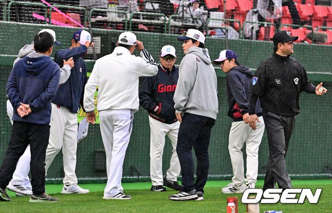 26일 일본 미야자키 산마린 스타디움에서 두산 베어스와 롯데 자이언츠의 구춘대회 경기가 열렸다. 두 팀의 맞대결은 롯데가 6-2로 앞선 3회말 악천후로 인해 노게임 선언됐다. 경기 전부터 내리던 비가 멈추지 않자 3회말 시작을 앞두고 두산 김원형 감독과 롯데 김태형 감독이 합의 하에 경기를 조기 종료하고 있다. 2026.02.26 /jpnews@osen.c