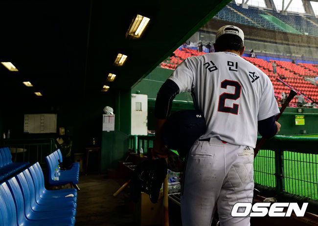 26일 일본 미야자키 산마린 스타디움에서 두산 베어스와 롯데 자이언츠의 구춘대회 경기가 열렸다. 두 팀의 맞대결은 롯데가 6-2로 앞선 3회말 악천후로 인해 노게임 선언됐다. 노게임이 선언되며 두산 김민석이 장비를 챙기고 있다. 2026.02.26 /jpnews@osen.co.kr