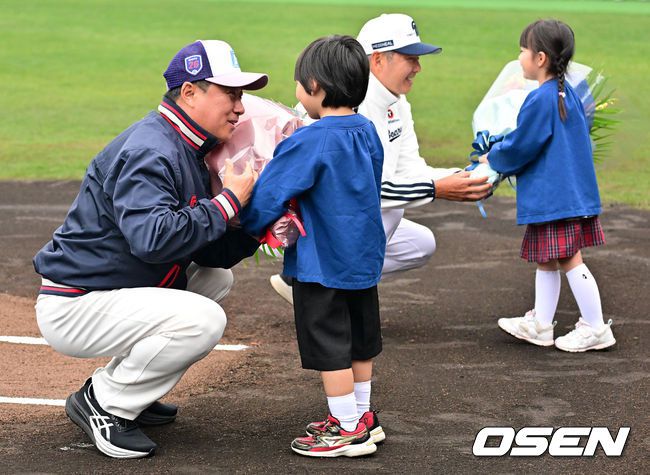 26일 일본 미야자키 산마린 스타디움에서 두산 베어스와 롯데 자이언츠의 구춘대회 경기가 열렸다. 두 팀의 맞대결은 롯데가 6-2로 앞선 3회말 악천후로 인해 노게임 선언됐다. 경기에 앞서 롯데 김태형 감독이 미야자키 어린이에게 꽃다발을 건네 받으며 미소짓고 있다. 2026.02.26 /jpnews@osen.co.kr