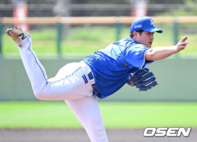 프로야구 삼성 라이온즈가 28일 일본 오키나와 나하 셀룰러 스타디움에서 일본프로야구 요미우리 자이언츠와 연습경기를 펼쳤다. 삼성은 요미우리를 상대로 최원태를 선발로 내세운다. 1회말 삼성 선발 최원태가 힘차게 공을 뿌리고 있다. 2026.02.28 / dreamer@osen.co.kr