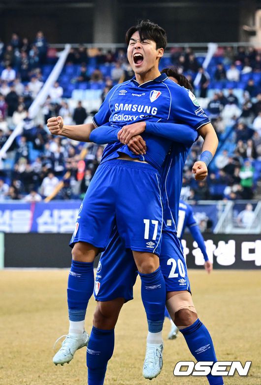 수원 삼성의 '정효볼'이 K리그2 역대 최다 관중인24071명 앞에서 화려하게 막을 올렸다. 수원은 28일오후 4시 30분 수원월드컵경기장에서 열린 하나은행 K리그2 2026 1라운드에서서울 이랜드를 상대로 2-1 역전승을 거뒀다. 수원 삼성 강현묵이 후반 역전골에 기뻐하고 있다. 2026.02.28 /cej@osen.co.kr