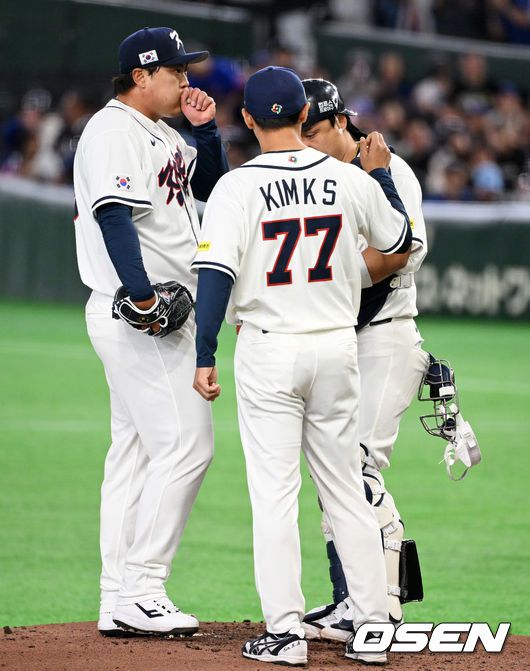 8일 일본 도쿄돔에서 2026 월드베이스볼클래식(WBC) 1라운드 C조 조별리그 대한민국과 대만의 경기가열렸다. 한국은 전날(7일) 일본과의 경기에서 6-8로 석패했다. 앞서 체코전을 11-4로 잡았던 한국은 1승1패를 마크하게 됐고, 남은 대만전과 호주전에 사활을 걸어야 한다. 2회초 2사 1,2루에서 한국 김광삼 투수코치가 마운드에 올라 류현진, 박동원