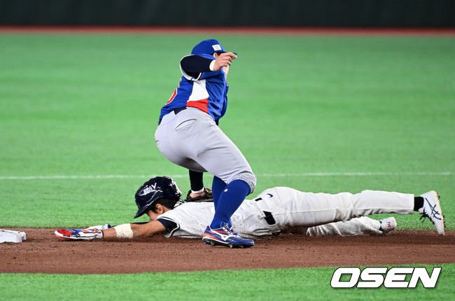 8일 일본 도쿄돔에서 2026 월드베이스볼클래식(WBC) 1라운드 C조 조별리그 대한민국과 대만의 경기가열렸다. 한국은 전날(7일) 일본과의 경기에서 6-8로 석패했다. 앞서 체코전을 11-4로 잡았던 한국은 1승1패를 마크하게 됐고, 남은 대만전과 호주전에 사활을 걸어야 한다. 7회말 2사 1루에서 한국 신민재가 2루 도루에 실패하고 있다. 2026.03