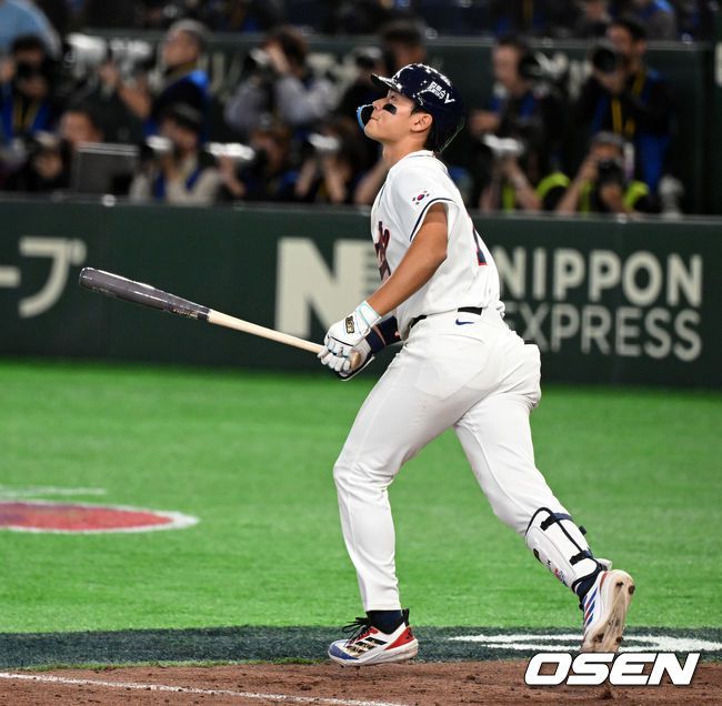 8일 일본 도쿄돔에서 2026 월드베이스볼클래식(WBC) 1라운드 C조 조별리그 대한민국과 대만의 경기가열렸다. 한국은 전날(7일) 일본과의 경기에서 6-8로 석패했다. 앞서 체코전을 11-4로 잡았던 한국은 1승1패를 마크하게 됐고, 남은 대만전과 호주전에 사활을 걸어야 한다. 9회말 2사 1,2루에서 한국 김주원이 중견수 플라이로 물러나고 있다. 202