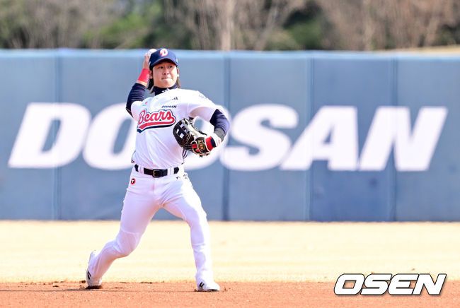 12일 경기도 이천 두산베어스파크에서 ‘2026 신한 SOL KBO리그’ 시범경기 두산 베어스와 키움 히어로즈의 경기가 열렸다. 시범경기는오늘(12일)부터오는 24일까지 진행되며, 각 팀이 12경기씩 치러 총 60경기가 펼쳐질 예정이다. 두산 유격수 박찬호가 경기 시작을 준비하고 있다. 2026.03.12 / dreamer@osen.co.kr
