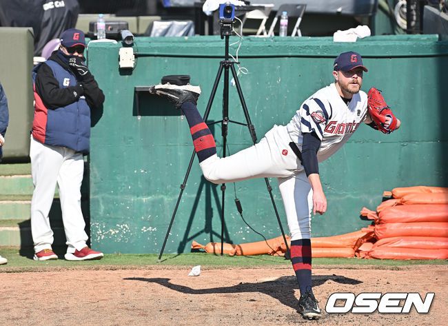 13일 부산 사직야구장에서 2026 신한 SOL KBO 리그 롯데 자이언츠와 KT 위즈의 시범경기가 열린다. WBC 차출 선수가 없는 롯데는 전날 경기에서 사실상의 베스트 라인업으로 KT를 4-3으로 꺾고 역전승을 거뒀다. 롯데 자이언츠 제레미 비슬리가 김상진 코치가 지켜보는 가운데 불펜 투구를 하고 있다. 2026.03.13 / foto0307@osen.