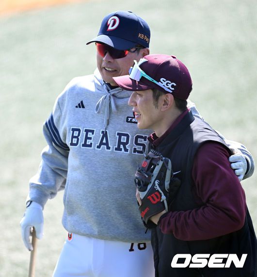 13일 경기도 이천 베어스파크에서 ‘2026 신한 SOL KBO리그’ 시범경기 두산 베어스와 키움 히어로즈의 경기가 열렸다. 시범경기는12일부터24일까지 진행되며, 각 팀이 12경기씩 치러 총 60경기가 펼쳐질 예정이다. 경기에 앞서 두산 홍원기 코치가 키움 서건창과 이야기를 나누고 있다. 2026.03.13 /sunday@osen.co.kr