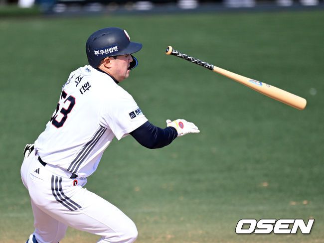 두산 베어스가 키움 히어로즈와 시범경기에서 완승을 거뒀다. 두산은 13일 이천에서 열린 키움과 시범경기에서 8-1로 이겼다. 이날 박찬호가 동점 적시타를 때렸고, 박지훈이 쐐기 홈런을 터트렸다. 6회말 2사 3루에서 두산 양석환이 적시타를 치고 있다. 2026.03.13 /sunday@osen.co.kr