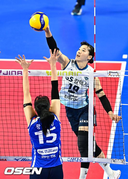 14일 오후 경기도 화성종합실내체육관에서 진에어 2025-2026 여자배구 V리그 IBK기업은행과 GS칼텍스의 경기가 진행됐다. GS칼텍스(18승16패·승점 54)는 5위 IBK기업은행(승점 51)의 추격을 받는 4위로, 이날 승리하면 IBK기업은행이 남은 1경기를 모두 이겨도 승점에서 따라잡을 수 없어 최소 준플레이오프 진출을 확정하게 된다. 1세트 GS