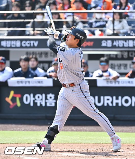 17일 오후 한화생명볼파크에서 2026 신한 SOL KBO 리그 시범경기 한화 이글스와 두산 베어스의 경기가 진행됐다. 전날 경기에서는 두산이 한화를 상대로 8-4 승리를 거뒀다. 1회말 2사 한화 강백호가 안타를 날리고 있다 2026.03.17 / soul1014@osen.co.kr