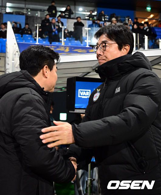 18일 오후 인천축구전용경기장에서 '하나은행 K리그1 2026' 4라운드 인천 유나이티드와 대전 하나시티즌의 경기가 열렸다. 인천은 1무 2패(승점1점)로 리그 10위, 대전은 3무(승점 3점)로 7위에 올라 있다. 양 팀 모두 첫 승이 간절한 상황이다. 경기 전 인천 윤정환 감독, 대전 황선홍 감독이 악수를 하고 있다. 2026.03.18 /cej@ose