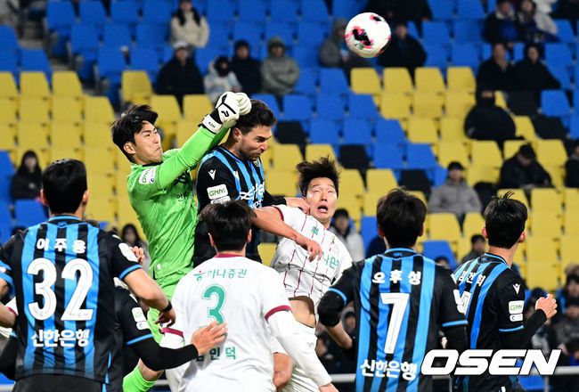 18일 오후 인천축구전용경기장에서 '하나은행 K리그1 2026' 4라운드 인천 유나이티드와 대전 하나시티즌의 경기가 열렸다. 인천은 1무 2패(승점1점)로 리그 10위, 대전은 3무(승점 3점)로 7위에 올라 있다. 양 팀 모두 첫 승이 간절한 상황이다. 후반 인천 김동헌이 선방을 하고 있다. 2026.03.18 /cej@osen.co.kr